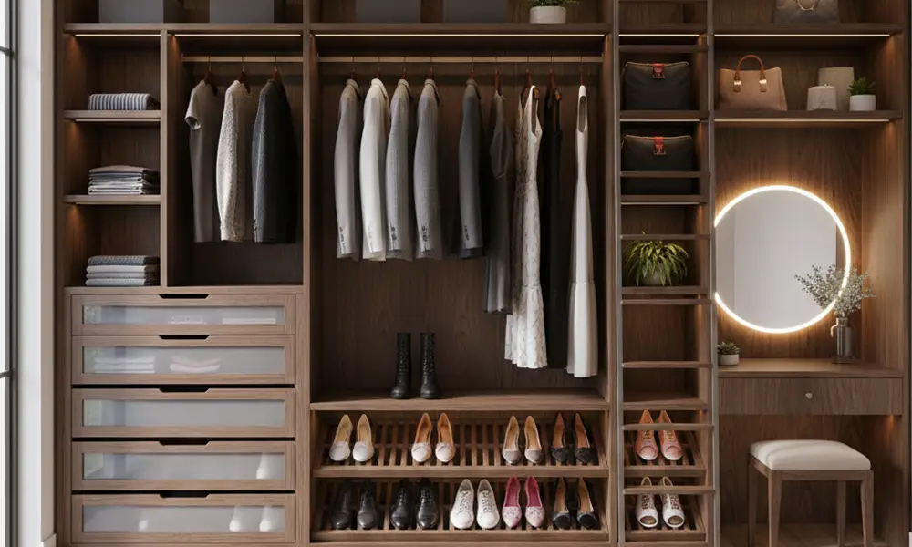 Em closets pequenos, os acessórios assumem papel estratégico. Cabideiros basculantes, gavetas com divisórias internas, calceiros deslizantes e soluções retráteis aumentam a capacidade de armazenamento sem ampliar a área ocupada.